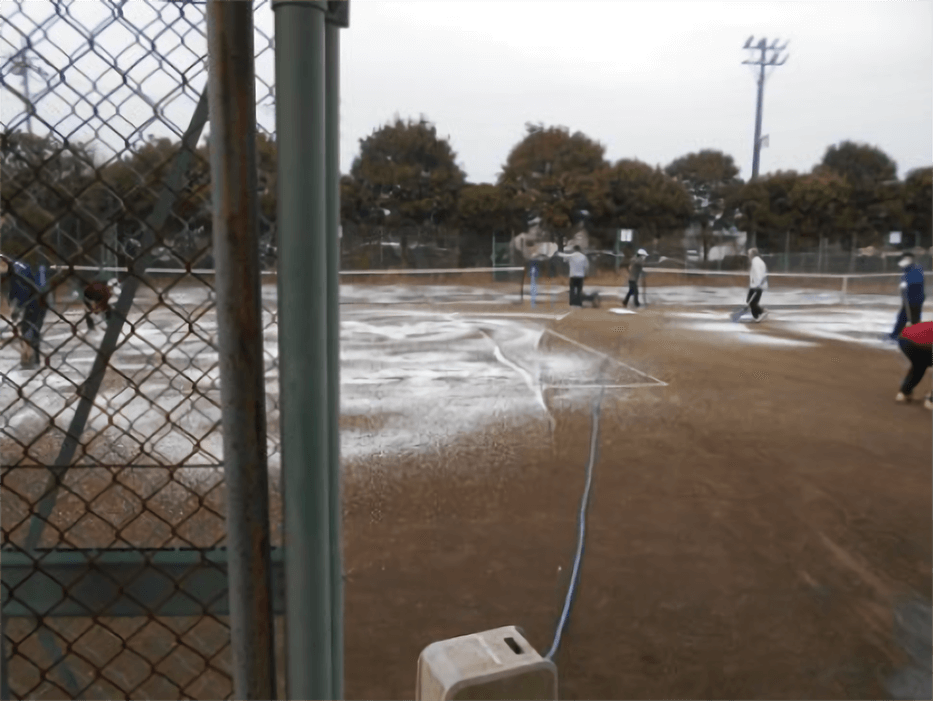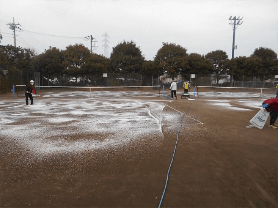 FUNくらぶ会員のテニスサークルの皆様、約20名でテニスコート(クレー)に塩化カルシウムを散布していただききました。
